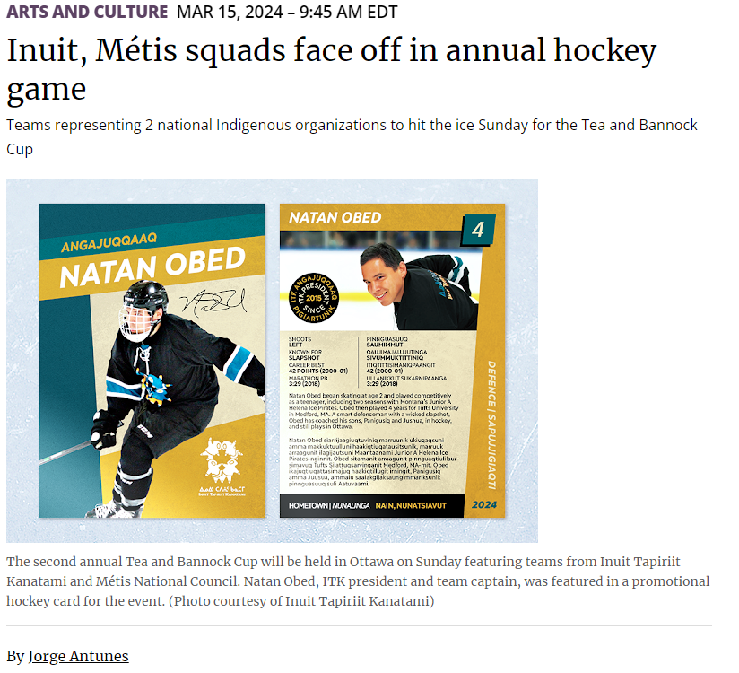 A year’s worth of bragging rights will be on the line Sunday when Inuit Tapiriit Kanatami faces off against reigning champion Métis National Council in the second annual Tea and Bannock Cup hockey game in Ottawa.
