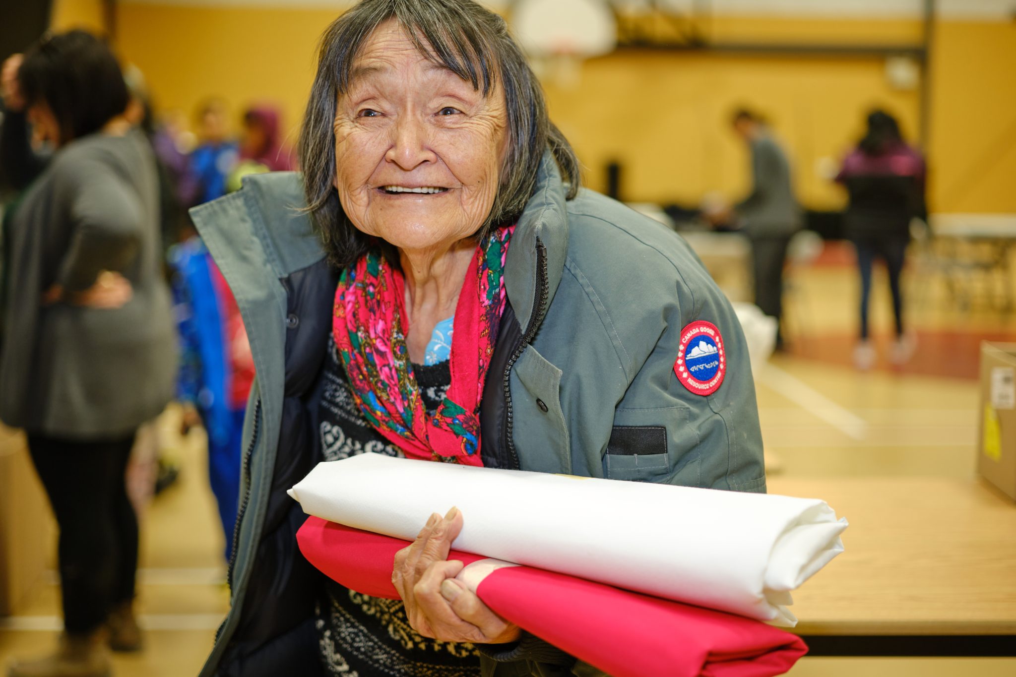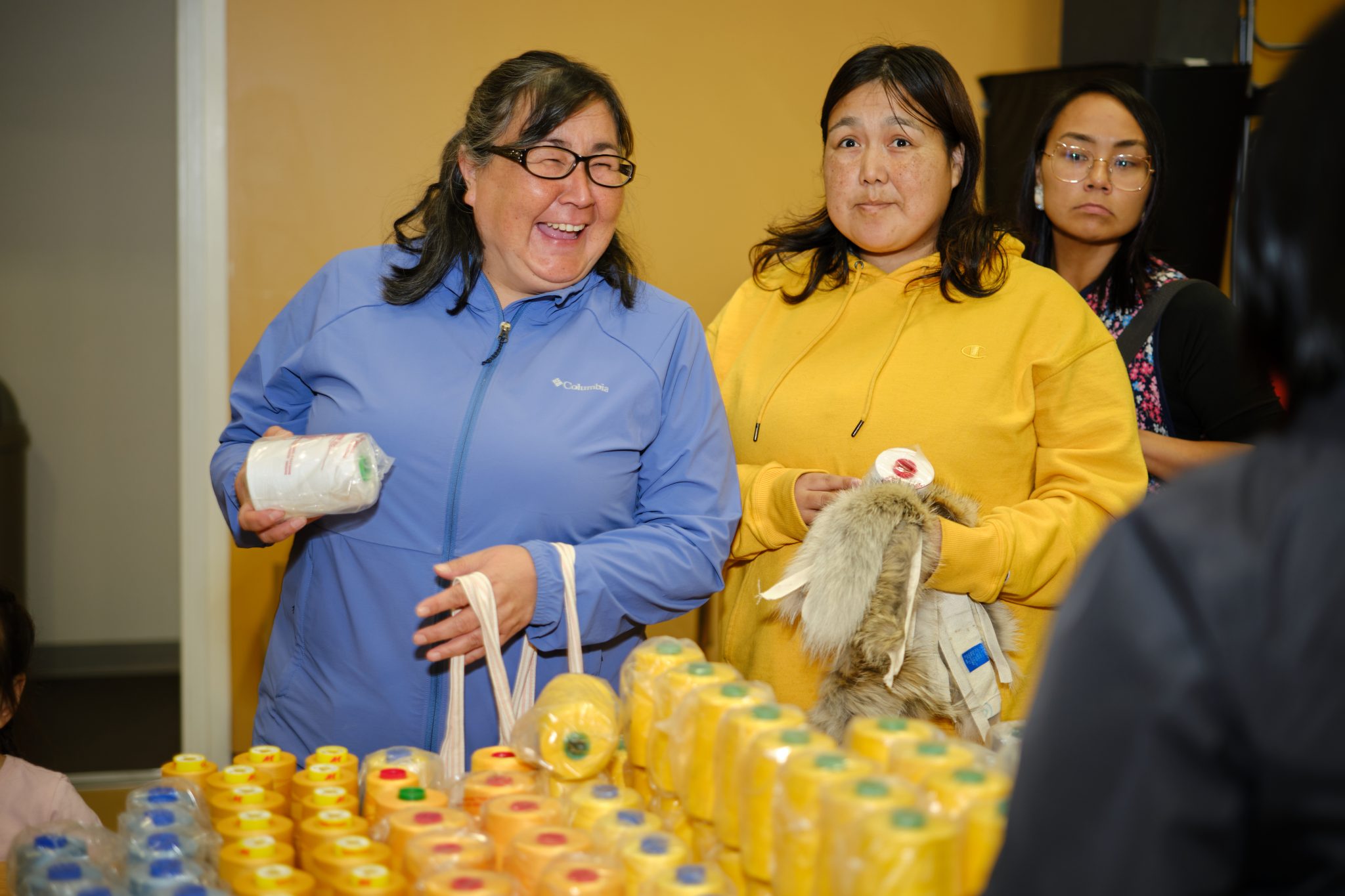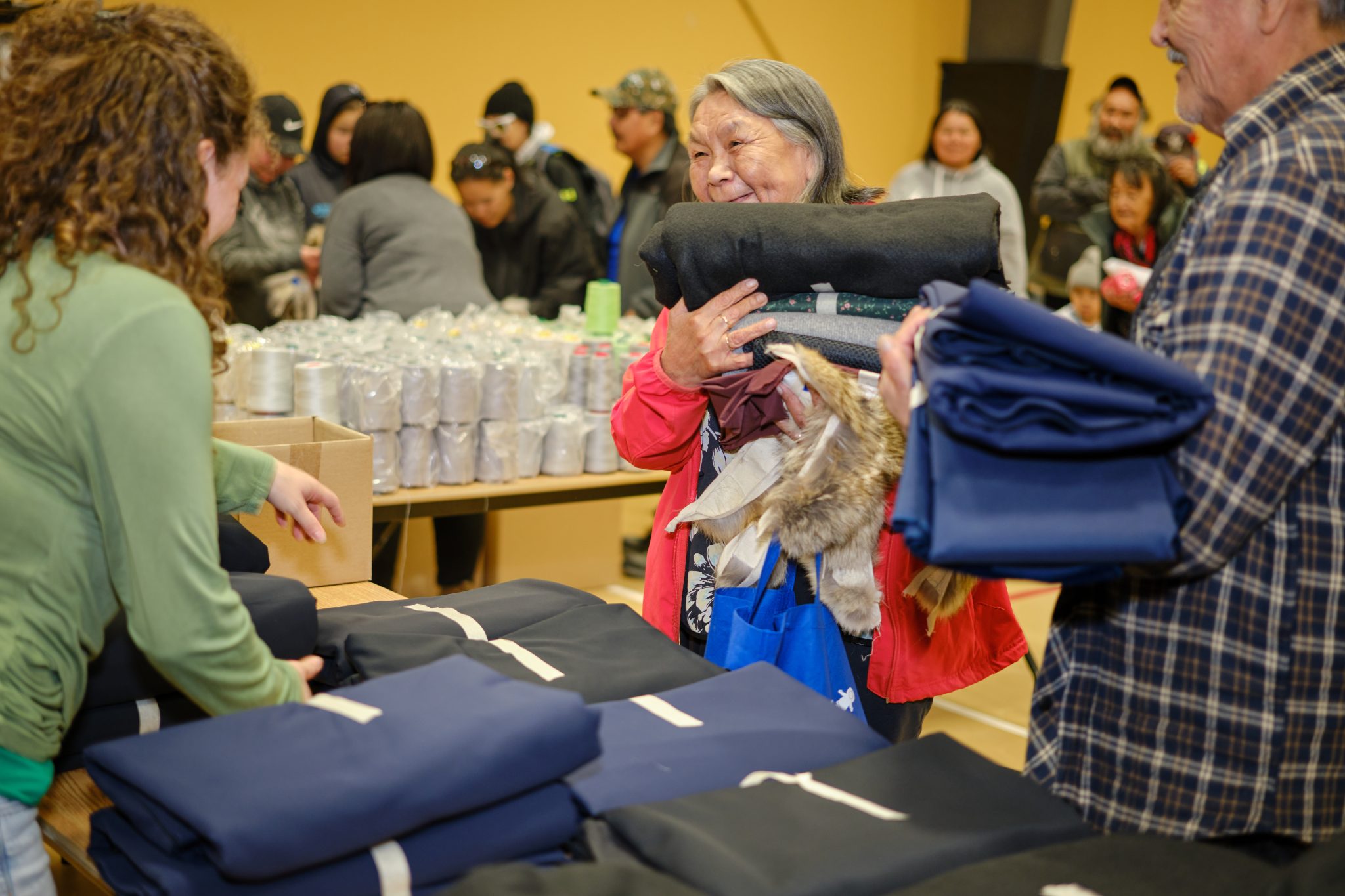 TECHNICAL FABRICS, PARKA LINING, thread skeins and coyote fur stretched across one end of Nain’s Jeremias Sillett Community Centre for a pop-up material giveaway last fall. A shipping container full of fabric arrived in the community just in time for the first Canada Goose Resource Centre event in Nunatsiavut. The event was greeted enthusiastically by Nainimiut, who eagerly waited in line to stock up on precious sewing goods for the coming season’s parkas.
