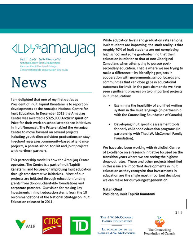 Amaujaq Newsletter 2015 October I am delighted that one of my first duties as President of Inuit Tapiriit Kanatami is to report on developments at the Amaujaq National Centre for Inuit Education. In December, 2013 the Amaujaq Centre was awarded a $325,000 Arctic Inspiration Prize for their work on school attendance initiatives in Inuit Nunangat. The Prize enabled the Amaujaq Centre to move forward on several projects including youth-directed video productions on stay-in-school messages, community-based attendance projects, a parent-school toolkit and joint projects with northern partners.
