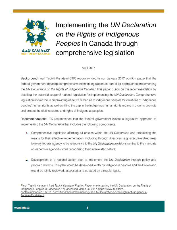 Inuit Tapiriit Kanatami and the Métis National Council have co-authored this paper to identify how an Indigenous human rights commission and tribunal should be established and constituted based on the tools and authorities available in the United Nations Declaration on the Rights of Indigenous Peoples Act as well as in Canadian law.