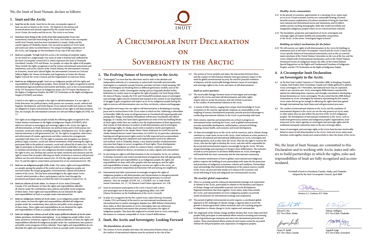 The Circumpolar Declaration on Sovereignty in the Arctic developed by the Inuit Circumpolar Council (ICC).