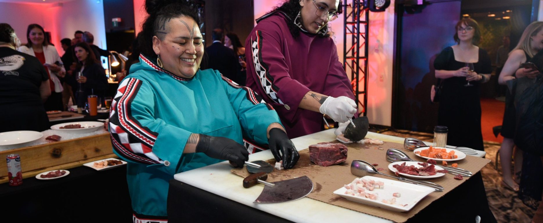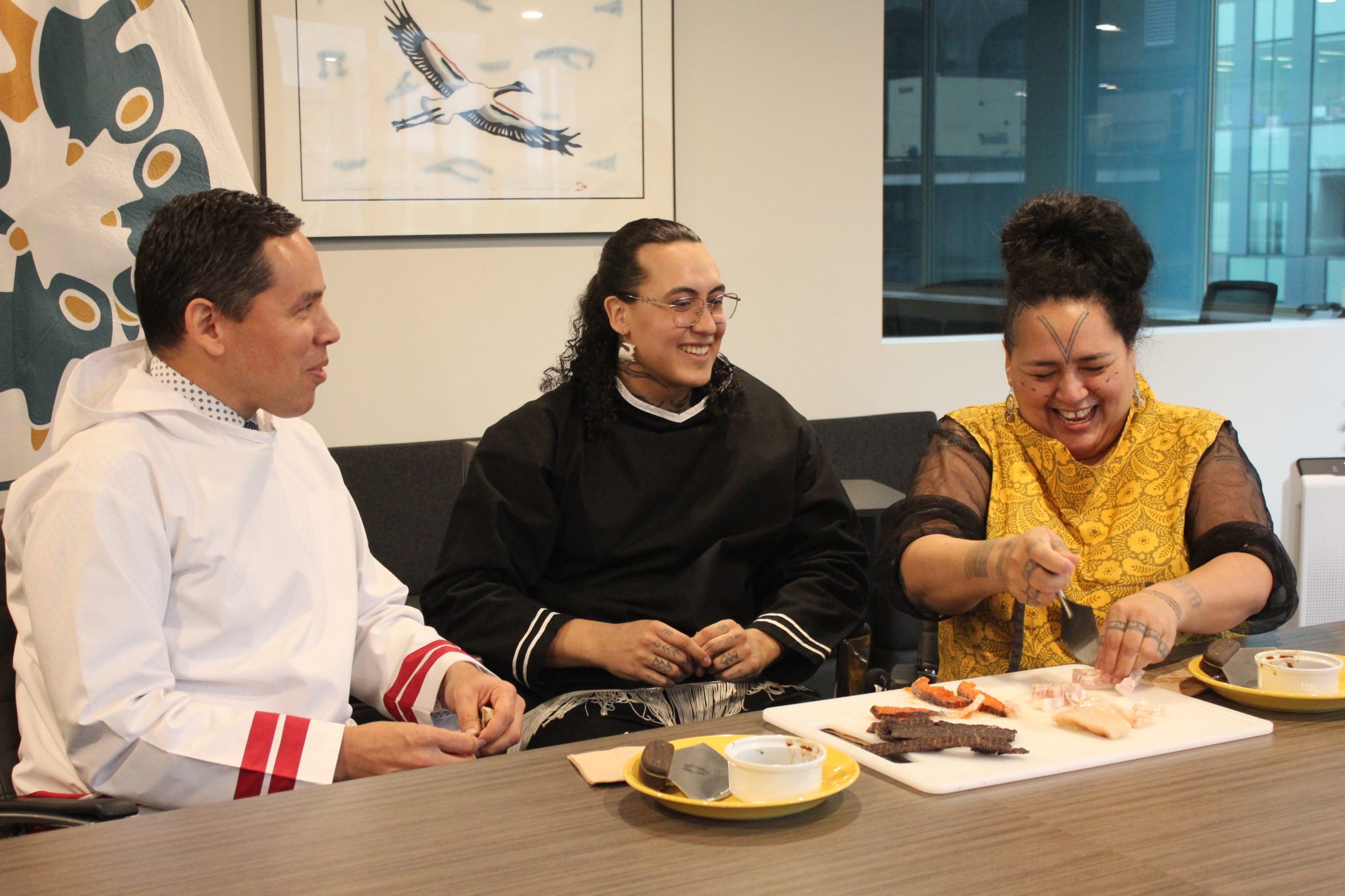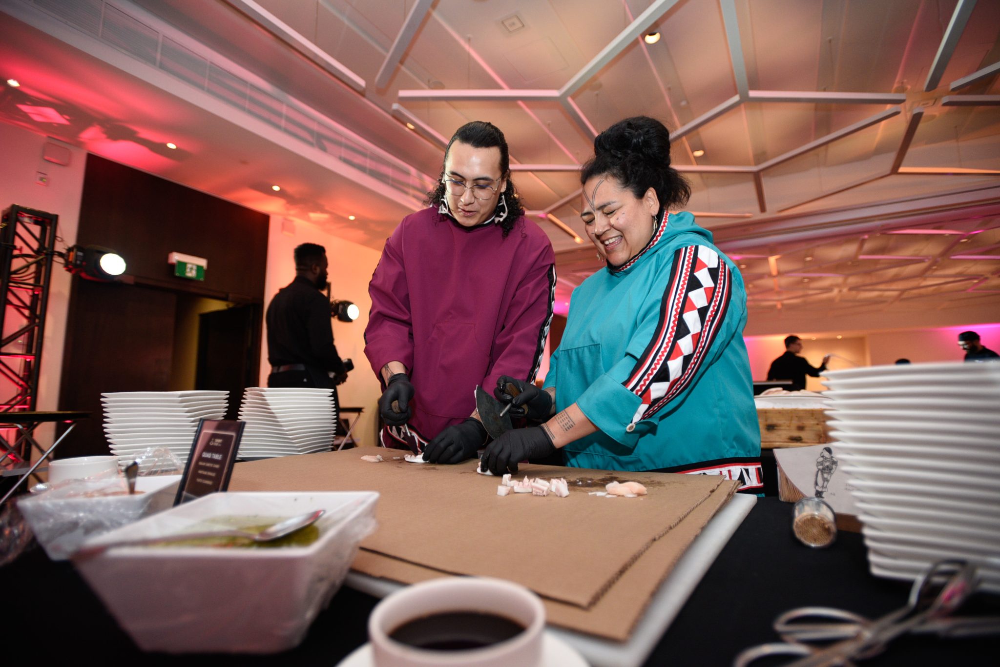 Braden Kadlun Johnston and his mother Hovak Johnston prep country food with ITK President Natan Obed © Lisa Gregoire