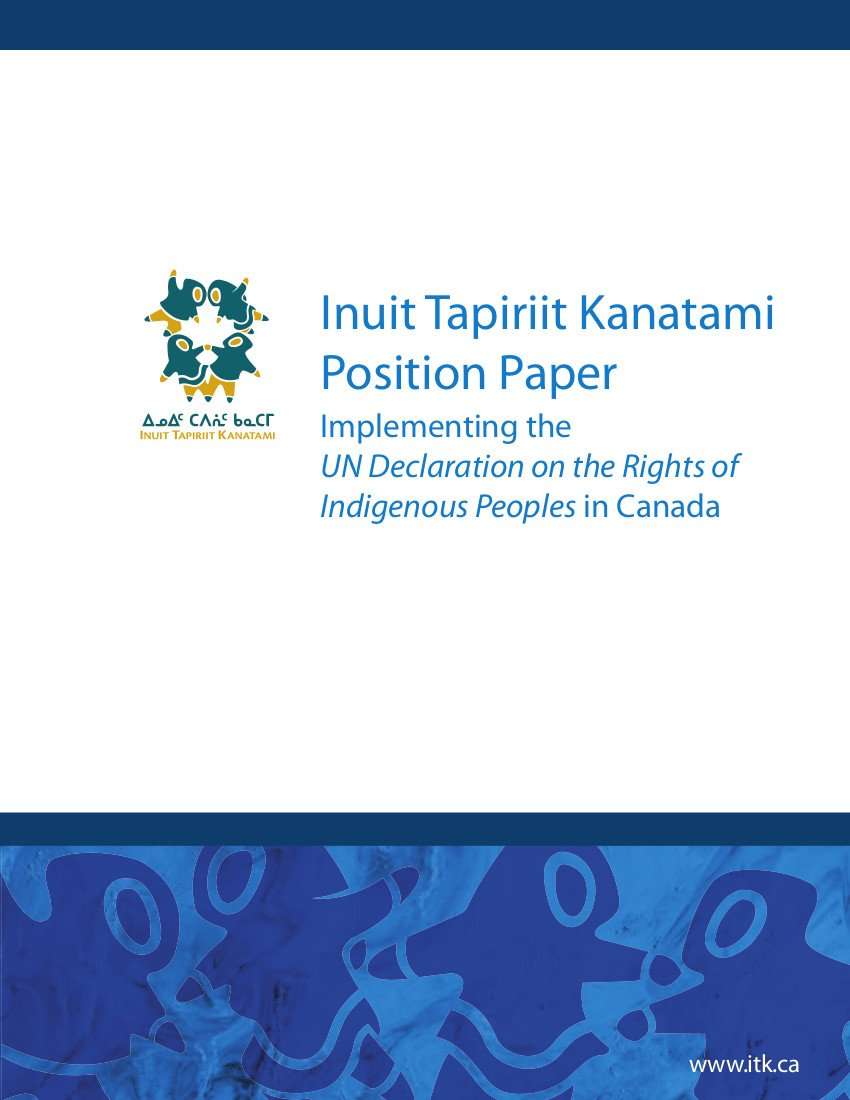 This position paper outlines the expectations of Inuit Tapiriit Kanatami (ITK) regarding the Government of Canada’s support for and commitment to implementing the UN Declaration on the Rights of Indigenous Peoples (UNDRIP). It provides an overview of the UNDRIP as well as a legal interpretation of its application to domestic law and policy. We describe Canada’s current political position and the progress the federal government has made in fulfilling its commitment to implementing the UNDRIP as well as our preferred approach to implementation. This position paper also makes policy recommendations for moving forward with implementing and upholding the human rights of Indigenous peoples in Canada.