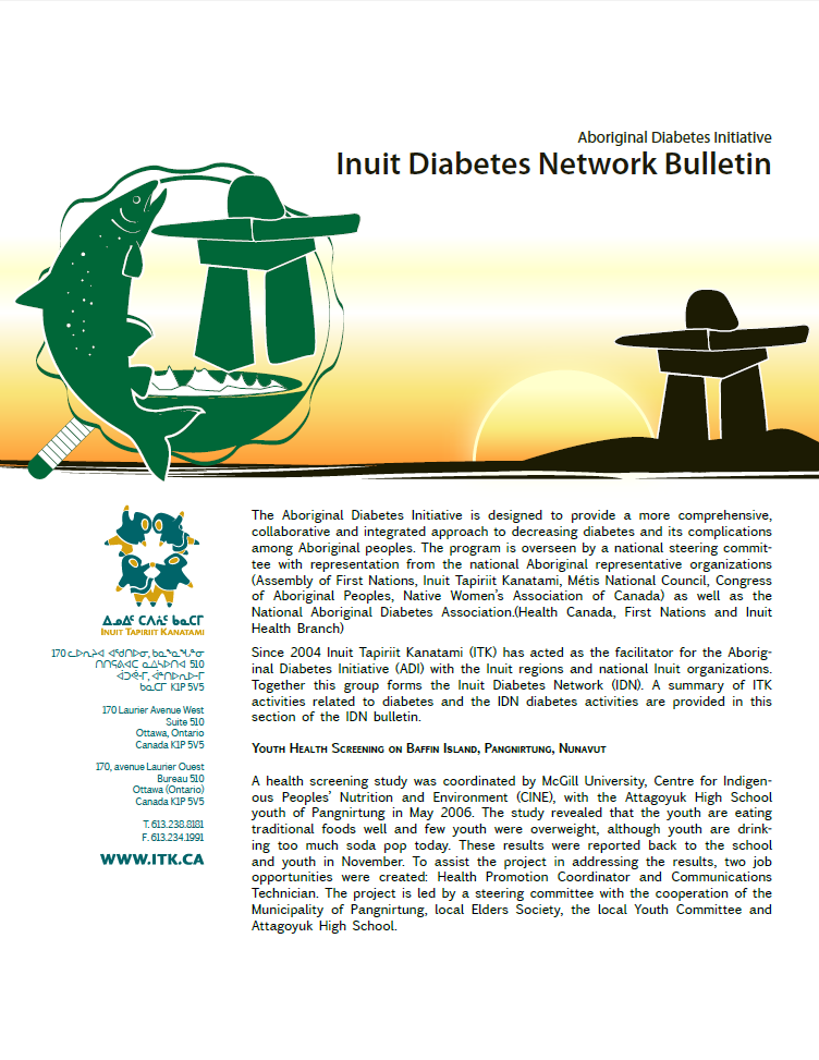 Since 2004, ITK has acted as the facilitator for the Aboriginal Diabetes Initiative (ADI) with the Inuit regions and national Inuit organizations. Together this group forms the Inuit Diabetes Network (IDN). A summary of ITK activities related to diabetes and the IDN diabetes activities are provided in this section of the IDN bulletin.