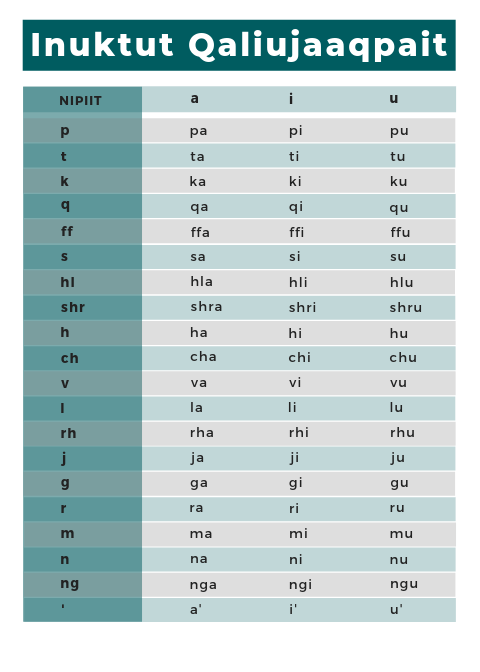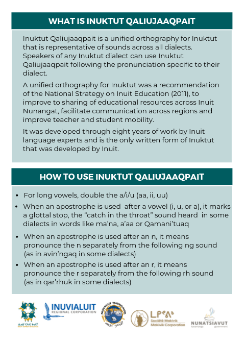 Inuktutย Qaliujaaqpaitย uses roman orthography to ensure it can be written in anyย Inuktutย dialect.ย Itย is important to note thatย Inuktutย Qaliujaaqpaitย does not replace syllabics โ regions can and will continue use of syllabicsย and other distinct writing systems.ย There is no expectation that people who already use older writing systems will have to change the way they write. Older writing systems will continue to be taught to younger generations.ย