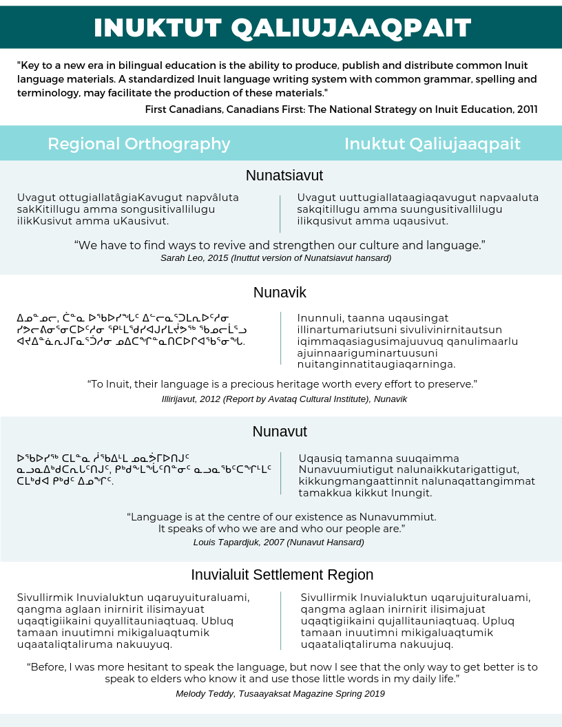 This work in standardization of aย unifiedย Qaliujaaqpaitย Inuktutย writing system demonstrates Inuit adaptability and resourcefulness as we embrace contemporary life in a globally connected world.ย Within Nunavut, we will continue to useย Qaniujaaqpaitย (syllabics), and will work with regional and national partners in adoption and use of our newly adoptedย Inuktutย Orthography.