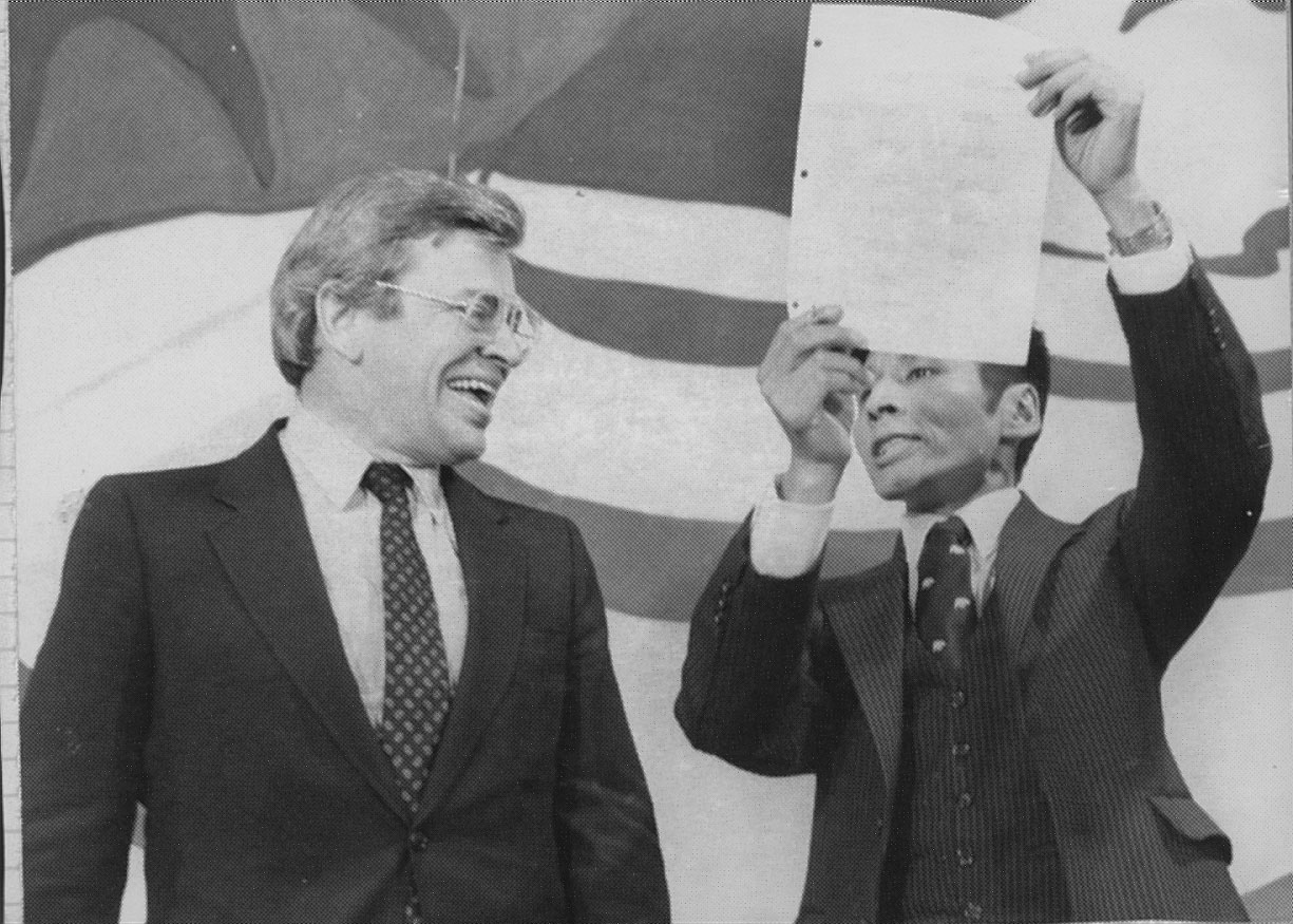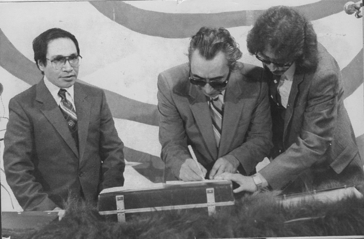 Nellie Cournoyea, Dennis Patterson, and Les Carpenter at the signing of the IFA in Tuktoyaktuk. © Inuvialuit Communications Society